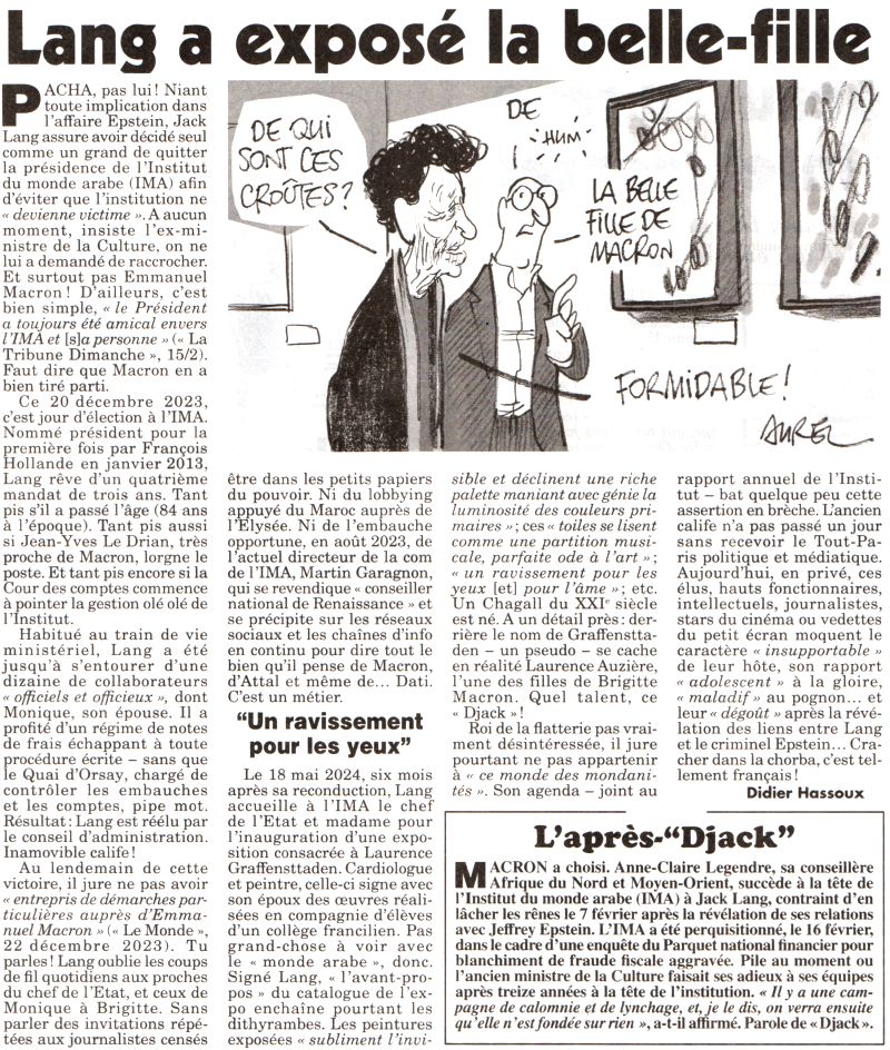 MISE A JOUR DU 19.02.2026 : Enfin un article du palmipède. Comme le dit Xavier Poussard "ça ne fait que commencer". Le plumitif de service a manifestement lu mes commentaires sur le sujet qui datent du 26 juin 2024, en affublant l'oeuvre (?) de Laurence AUZIÈRE d'un désobligeant "croûte", terme que j'avais employé. Mensonge potentiel : LANG a "exposé" à l'IMA alors qu'il y a des soupçons d'un ACHAT avec une ardoise de 570000€. Comme il y a eu une perquisition du Parquet National Financier, les fins limiers de la brigade financière ne devraient pas trop avoir de mal à retrouver la facture, ça fera plaisir à Nicolas.