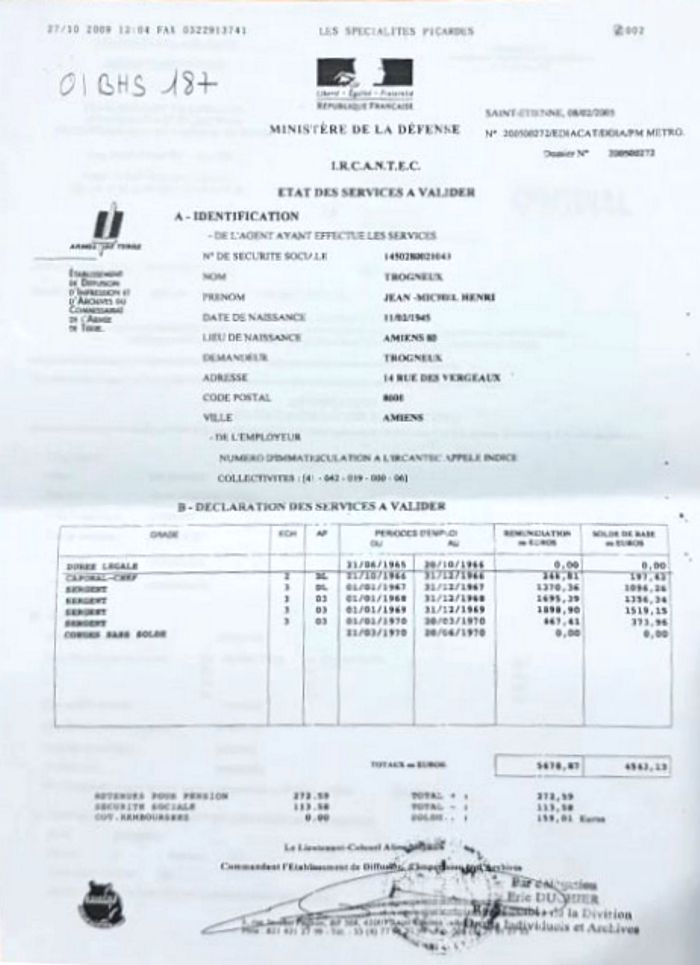 MISE A JOUR DU 19.12.2025 : Amandine Roy, qui a quelques raisons de ne pas pifer Jean Michel TROGNEUX a hérité d'une belle fuite, les documents publiés --authentiques-- ayant été manifestement photographiés à la sauvette à l'aide d'un téléphone. Comme il n'y a pas eu de transmission électronique, il va être très difficile aux barbouzes du cabinet noir de l'Aile Madame de retrouver la taupe. C'était fatal qu'un tel événement se produise, psychologiquement, il est difficile de garder pour soi un secret qui permet au monstre du château de coller les gens au tribunal, voire pire. C'est un coup terrible, du même calibre que le sursis de JMT en Algérie exhibé par Morhad El-Hattab. Y figure le numéro de sécu de JMT 1.45.02.80.021.043cc, car il a une ou deux autres caisses de retraite. Qu'en pense la CARSAT ? Et ces retraites arrivent par virement sur un ou des comptes bancaires, à Amiens ou rue du Faubourg St Honoré ? Une petite fuite chez les banquiers peut être ? La domiciliation c'est bien le 14 rue des Vergeaux. Henri le Petit Gros, complètement cramé, a t'il procuration ? Voir les commentaires et les documents : http://pressibus.free.fr/gen/trogneux/fil.html#55