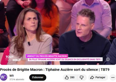 MISE A JOUR DU 20.01.2026 : Le Cyril se devait de servir la soupe à sa chérie. J'ai écouté attentivement cette vidéo W9, du classique. Sauf qu'à 7mn un des commentateurs (tous sont complices) lâche un "le" au lieu d'un "la"... poursuivre toute sa vie. Sa voisine, sourcils froncés, cherchait manifestement à comprendre le jeu de dupes auquel elle assistait. Cyril vouvoie Tiphaine alors qu'il est probable qu'ils se connaissent depuis très longtemps à faire des châteaux de sable sur la même plage (en cours de vérification). Plus j'observe Tiphaine plus je remarque que sa mâchoire inférieure et son menton ressemblent à ceux d'un portrait robot de la vraie Brigitte à paraître, et à ceux d'Anne Marie (Annie)Trogneux et de sa fille Christine Boulogne.