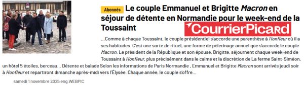 MISE A JOUR DU 03.11.2025 : Silence radio, rien dans la presse people. La photo de HONFLEUR INFO, qui devait être sous haute surveillance, semble authentique 2025. On remarque au fond que les illettrés sont parqués par trois flics le dos tourné. Quand au Courrier Picard et Paris Normandie c'est service minimum.